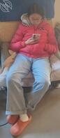 堂妹就穿着红色棉衣、牛仔裤、拖鞋和她最喜欢的白袜。她的白袜是我最喜欢的。
